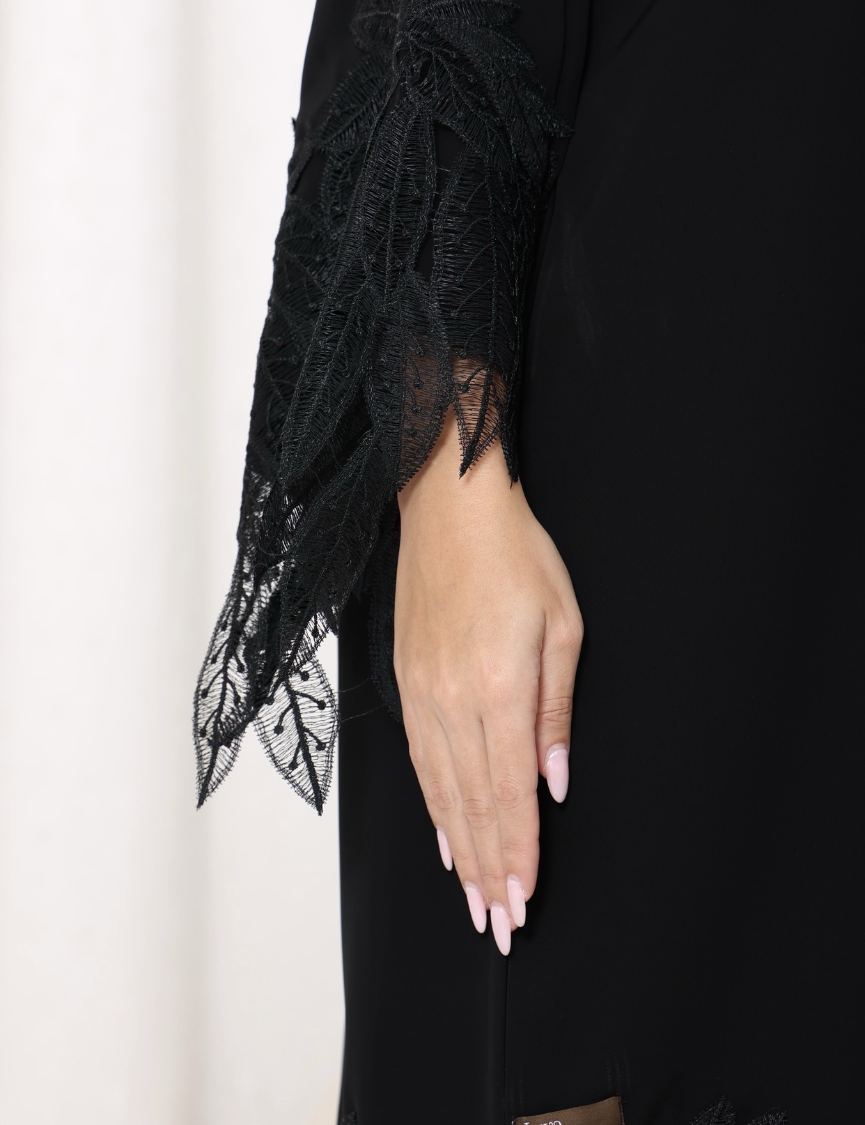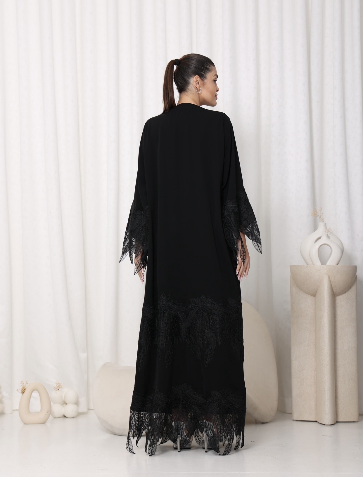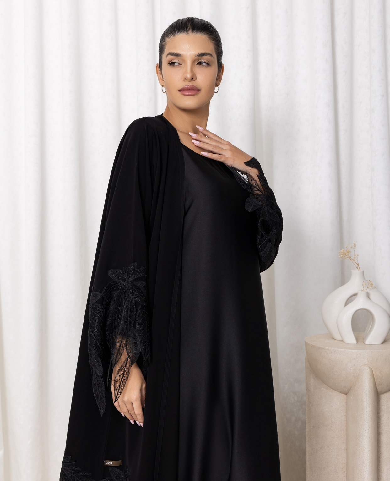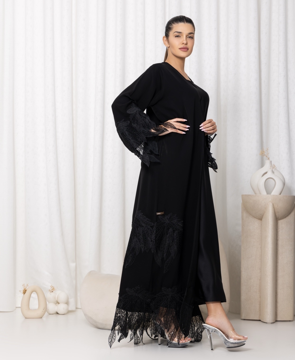 عباية سوداء بتصميم بسيط وأنيق، مع تفاصيل دانتيل بارزة عند الأطراف السفلية للأكمام وحافة العباية. تطريز الدانتيل يظهر بشكل أوراق الشجر أو أنماط نباتية، مما يضفي عليها لمسة فخمة. القماش ندى ناعماً وانسيابياً، مع قصّة واسعة ومريحة.