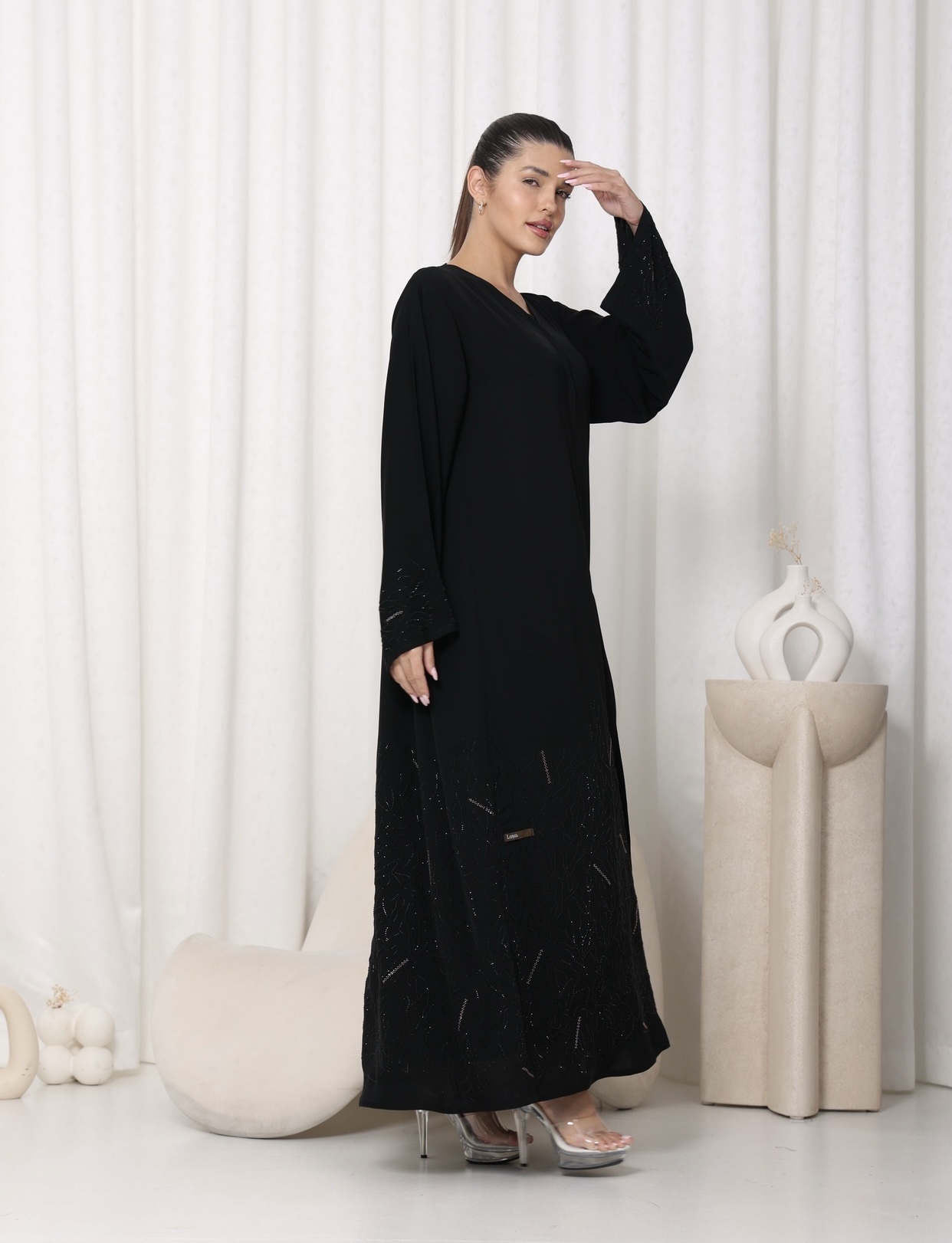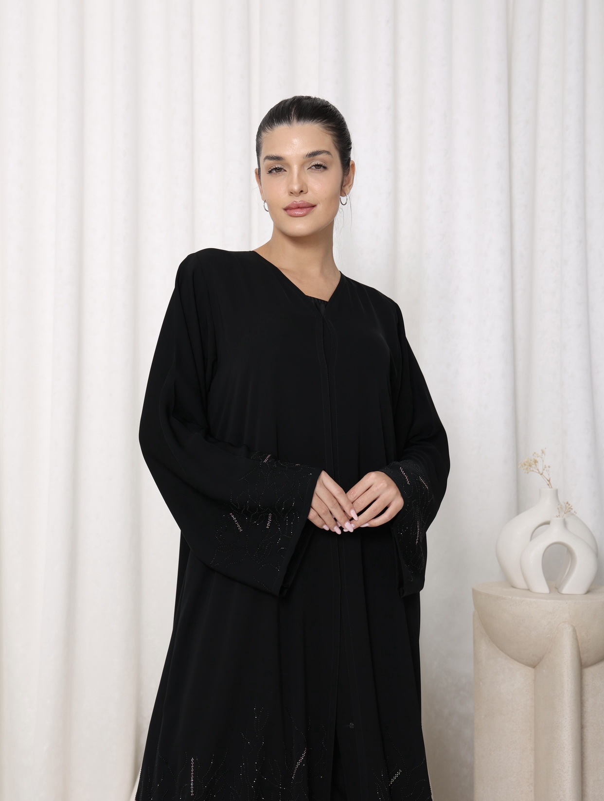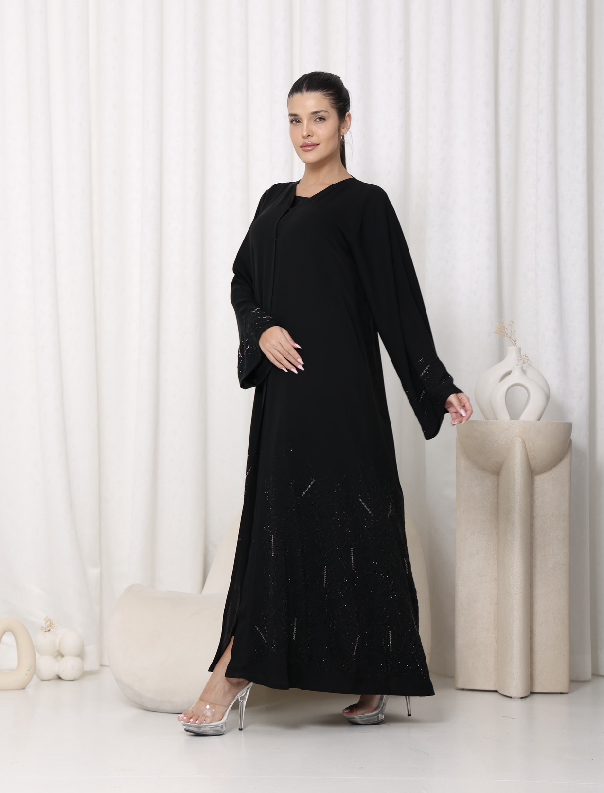 تتميز العباية بتصميم أنيق وبسيط بلون أسود كلاسيكي من قماش الندى تمتاز بأكمام واسعة وبقصة مريحة تتناسب مع مختلف الأذواق. القماش يحتوي على تفاصيل دقيقة من الخرز اللامع المتناثر بشكل فني على الأكمام وفي الجزء السفلي من العباية، مما يضفي لمسة من الفخامة والرقي، وهي مناسبة للارتداء اليومي أو للمناسبات. الإطلالة تجمع بين العصرية والبساطة مع لمسات من التميز في التفاصيل.