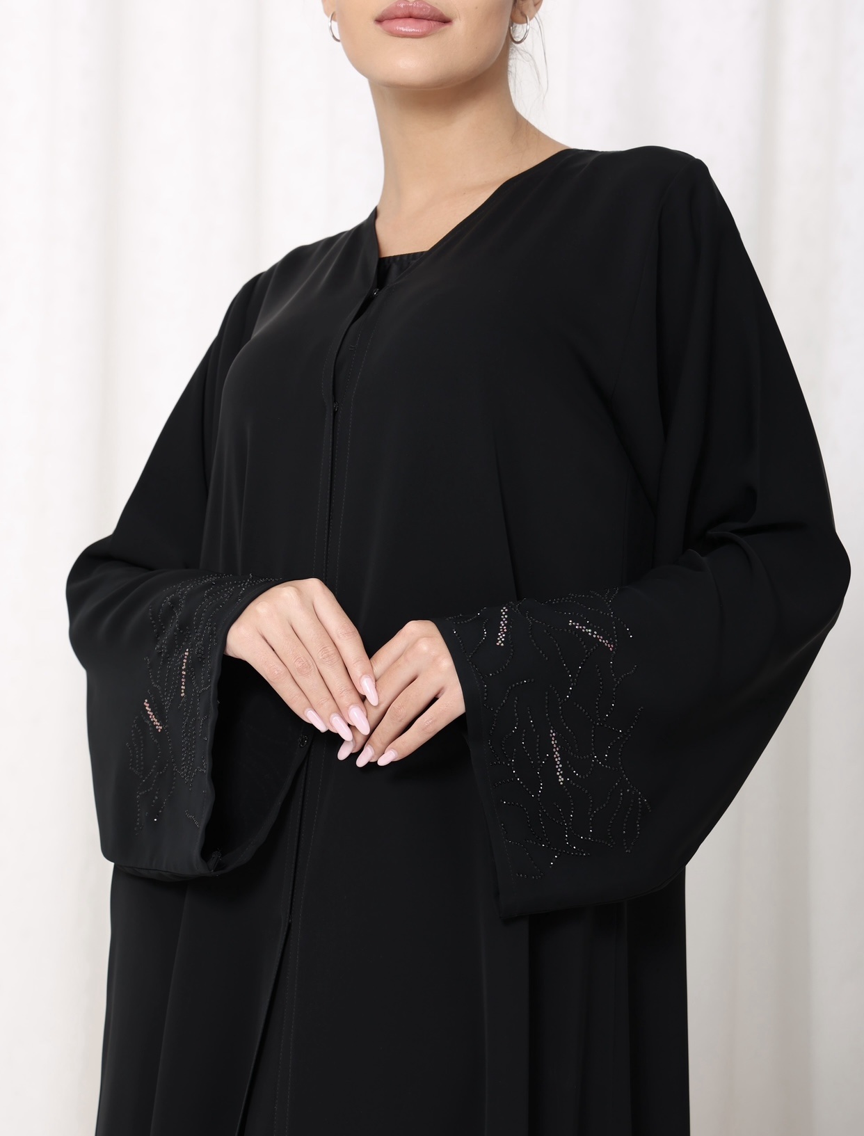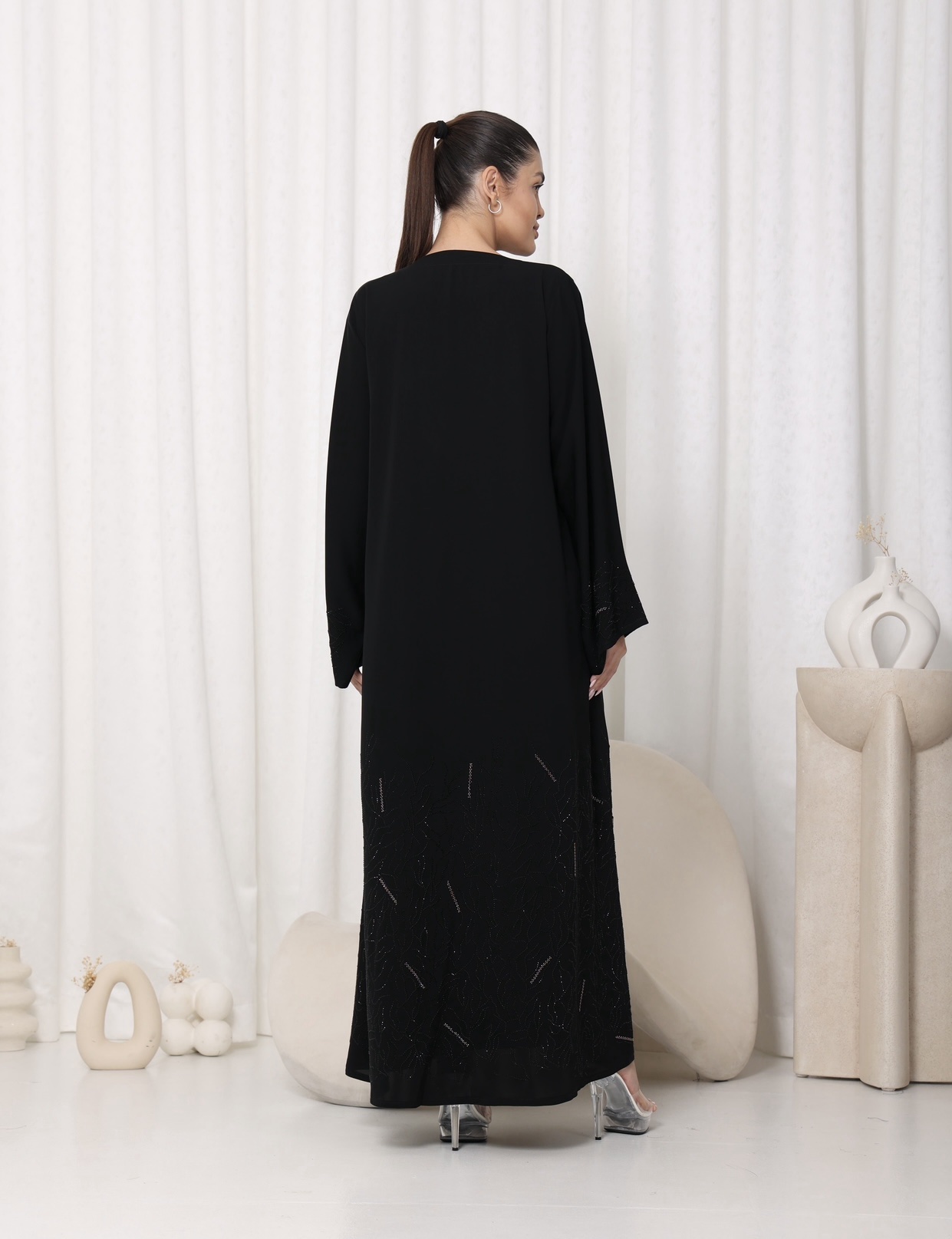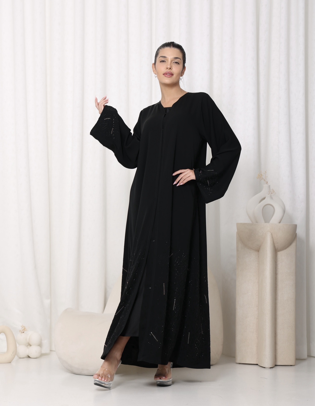 تتميز العباية بتصميم أنيق وبسيط بلون أسود كلاسيكي من قماش الندى تمتاز بأكمام واسعة وبقصة مريحة تتناسب مع مختلف الأذواق. القماش يحتوي على تفاصيل دقيقة من الخرز اللامع المتناثر بشكل فني على الأكمام وفي الجزء السفلي من العباية، مما يضفي لمسة من الفخامة والرقي، وهي مناسبة للارتداء اليومي أو للمناسبات. الإطلالة تجمع بين العصرية والبساطة مع لمسات من التميز في التفاصيل.