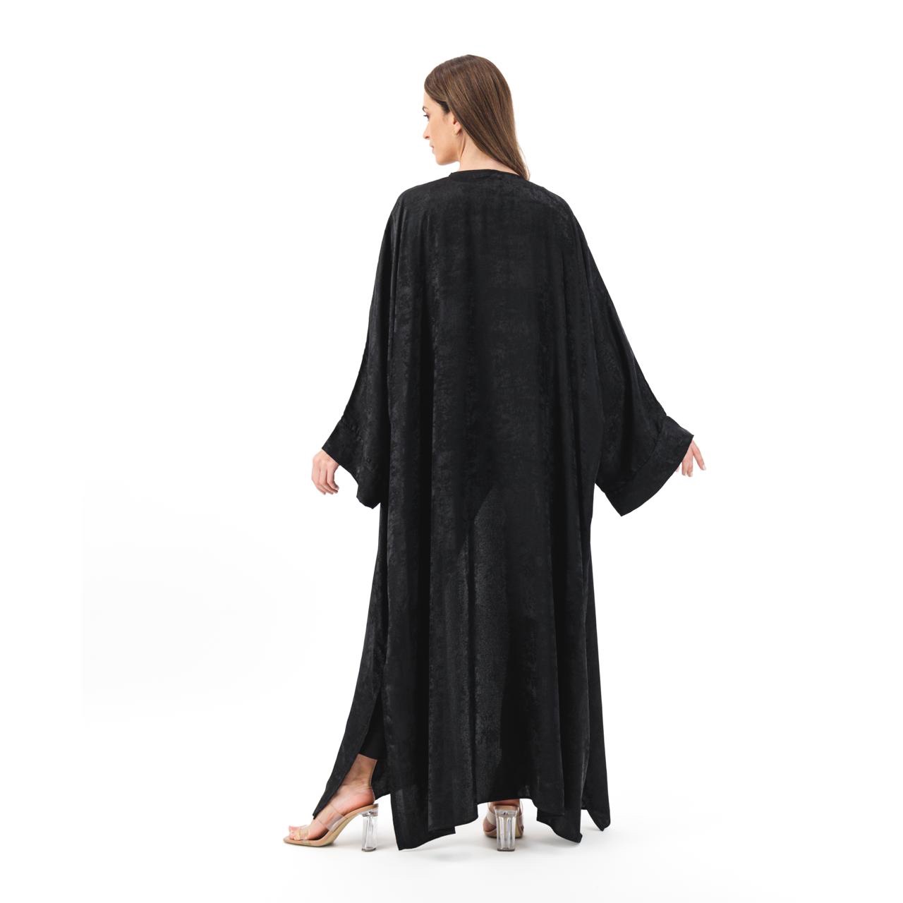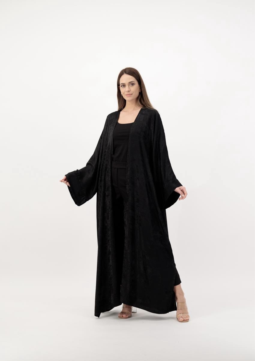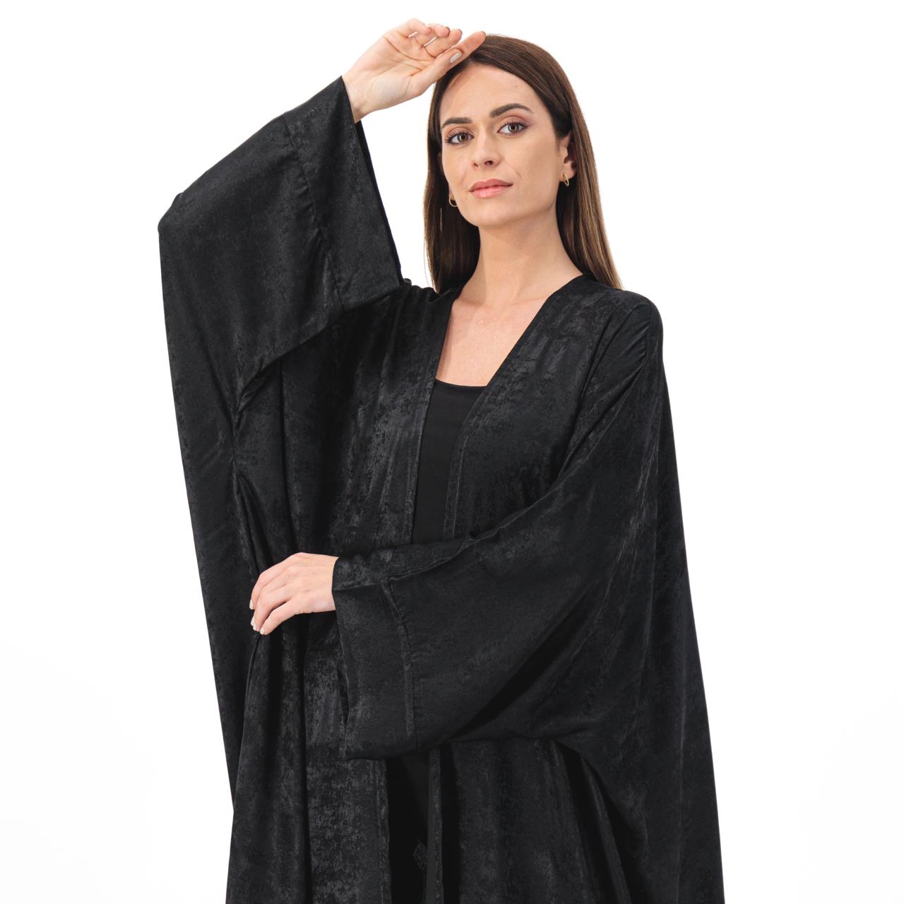 عباءة بشت أنيقة مصنوعة من قماش أسود داكن بلمعان خفيف للغاية، مما يعطيها لمسة فاخرة ومريحة للعين. العباءة مصممة بأسلوب عصري، مع فتحات صغيرة على الجانبين، من اليمين واليسار، للحركة.الأكمام واسعة ومريحة، مما يسمح بحرية حركة اليدين بشكل مريح، مما يجعلها مثالية للارتداء اليومي أو المناسبات الخاصة. القماش ناعم وخفيف على البشرة، ليمنح شعوراً بالراحة طوال اليوم مع الحفاظ على مظهر أنيق ومحتشم في نفس الوقت.